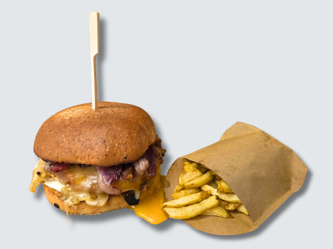 (Bun remplacé par des galettes de pommes de terre),Galettes de pommes de terre, steak haché de boeuf breton, poitrine fumée, confit d'oignons maison, raclette, ketchup artisanal, salade