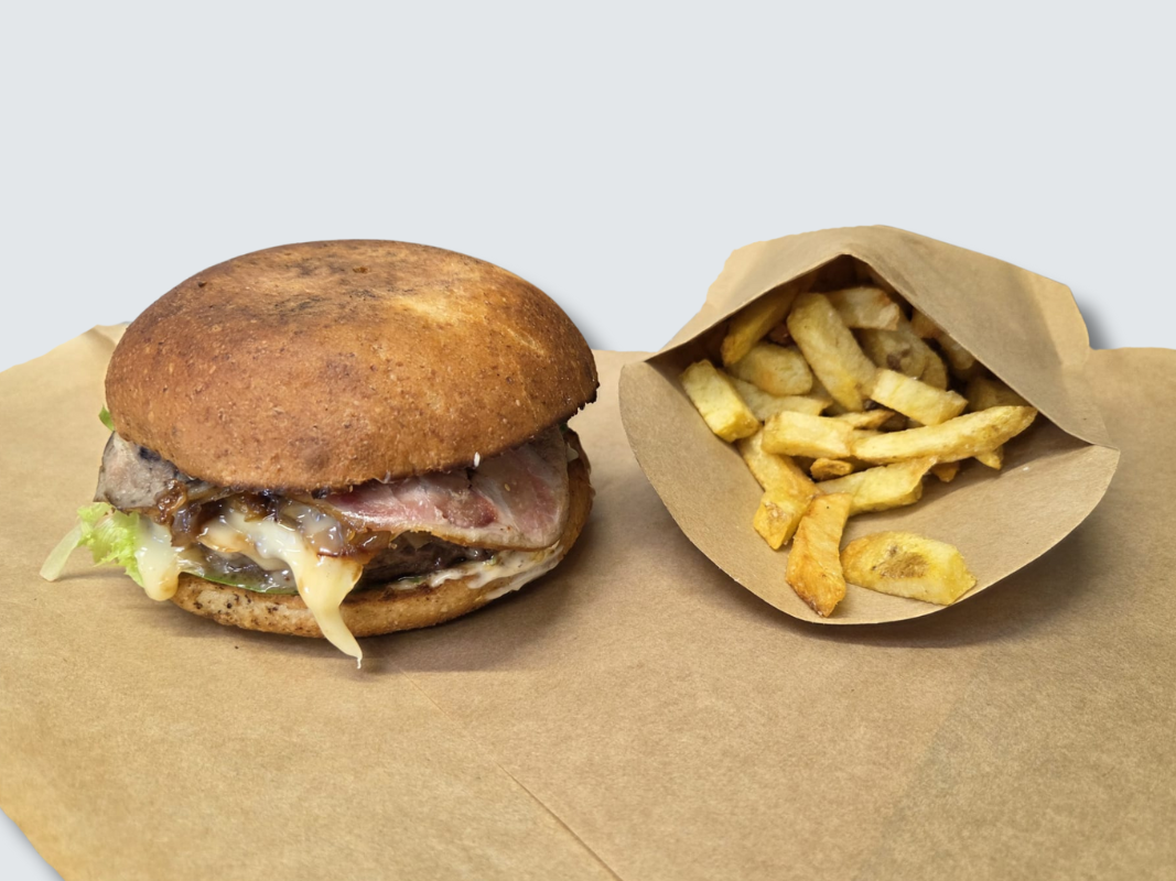 Bun maison, steak haché de boeuf breton, tomme de Savoie, poitrine fumée, confit d'oignons maison, salade, crème fraiche à la ciboulette fraiche