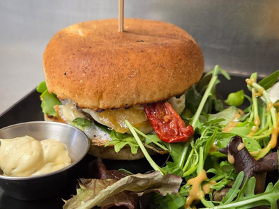 Bun maison, œuf à cheval, galette végétale, tome, tomates confites, salade, sauce béarnaise maison, pickles d'oignons rouges