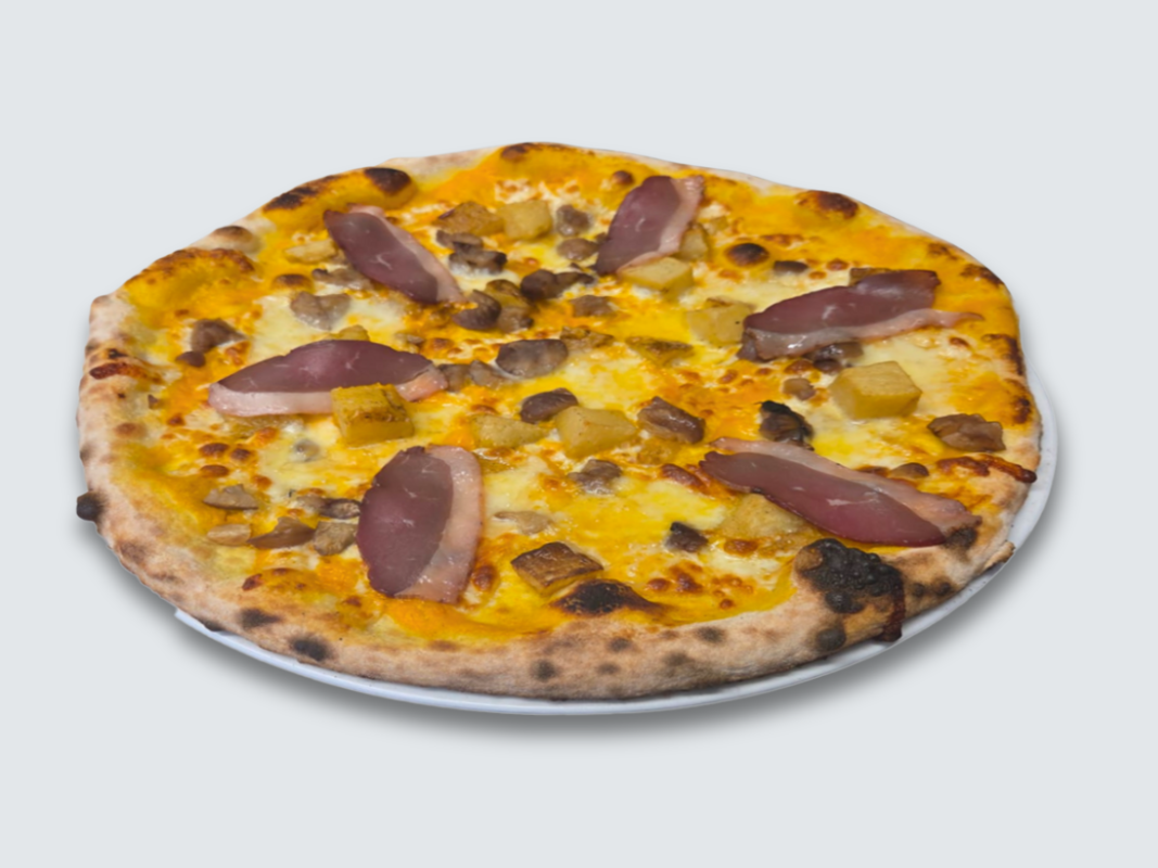 sauce tomate, mozzarella, jambon, œuf, champignons de Paris, le tout dans une pizza pliée