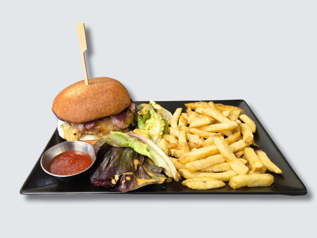 Bun maison, steak haché de boeuf breton, cheddar, tomates fraîches, pickles de cornichons, oignons rouges, mayonnaise, ketchup artisanal, salade