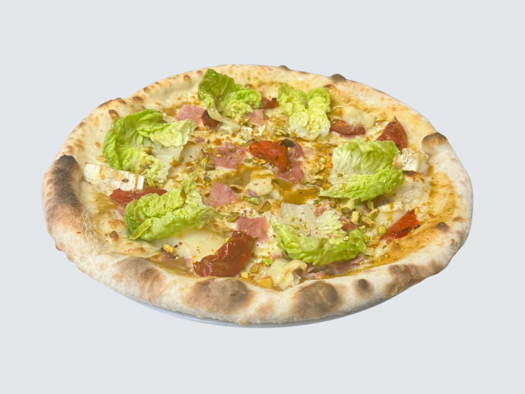 Base crème, mozzarella, jambon, chèvre, tomates confites, pistaches et crème de pistache, salade