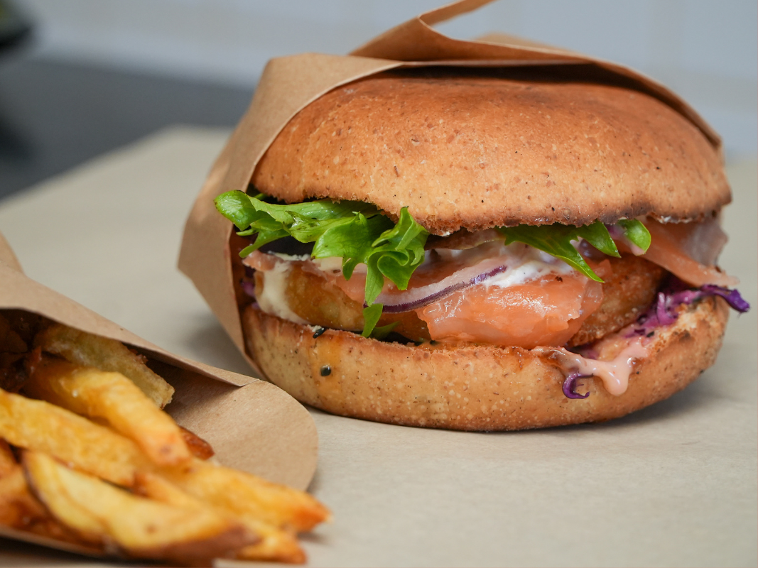 Bun maison, saumon, galette de pommes de terre, mozzarella de buffle, chou rouge, sauce asiatique, crème à la ciboulette fraîche, salade