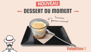 Nouveau dessert au restaurant Valentino à Sarzeau : laissez-vous tenter par notre tiramisu pomme caramel, une création maison ultra gourmande, fondante et délicieuse !